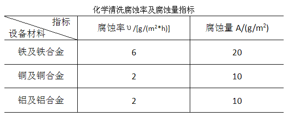 化學清洗時(shí)金屬腐蝕率和腐蝕量應不大於(yú)下表指标。